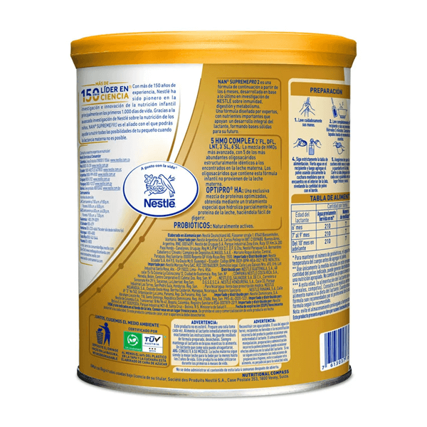 NAN® SUPREMEPRO 2 es nuestra fórmula más avanzada para bebés, basada en las investigaciones de Nestlé sobre inmunidad, digestión y metabolismo que son claves para la salud futura. Con 6 HMOs, olgosacáridos estructuralmente idénticos a los que se encuentran en la leche materna, que alimentan a los probióticos para una microbiota sana. DUAL PROBIOTICS. Combinación de 2 probióticos: B. lactis B. infantis este último presente en los bebés alimentados con leche materna. GENTLE OPTIPRO, un proceso tecnológico único para conseguir una exclusiva mezcla optimizada de proteínas parcialmente hidrolizadas.